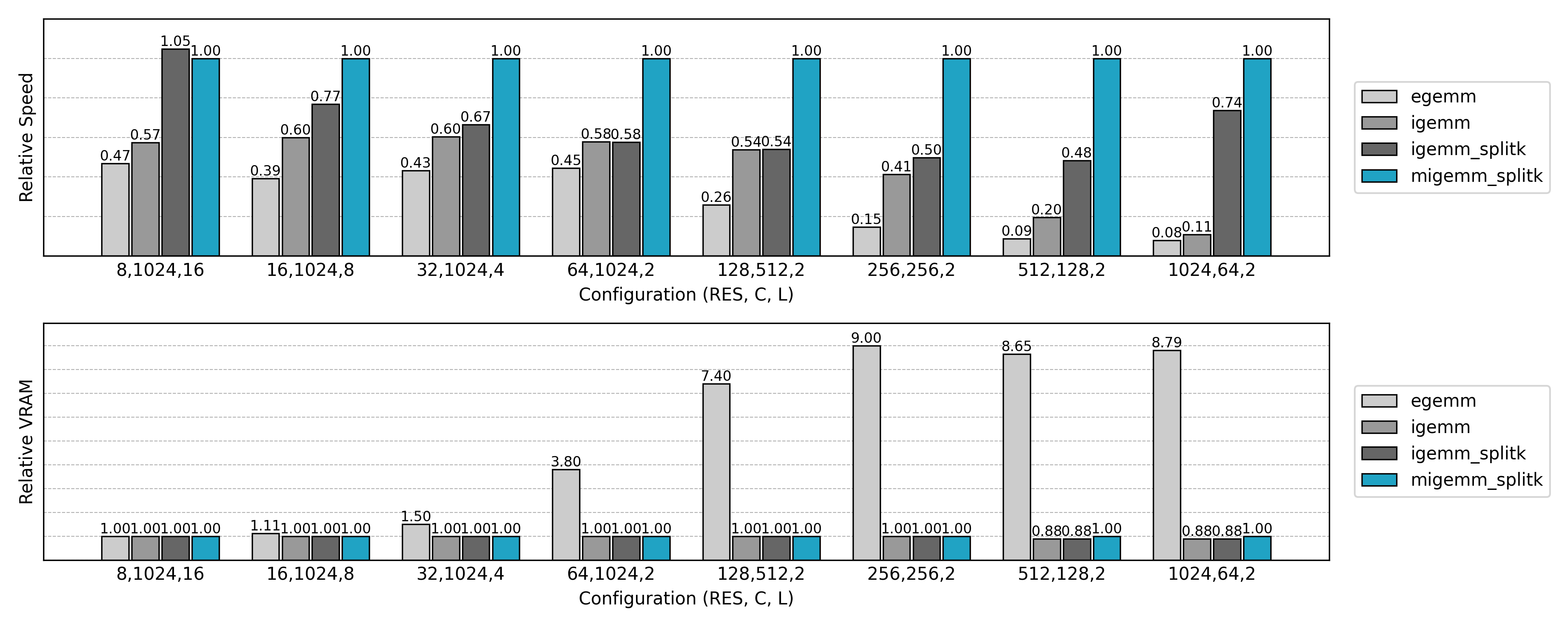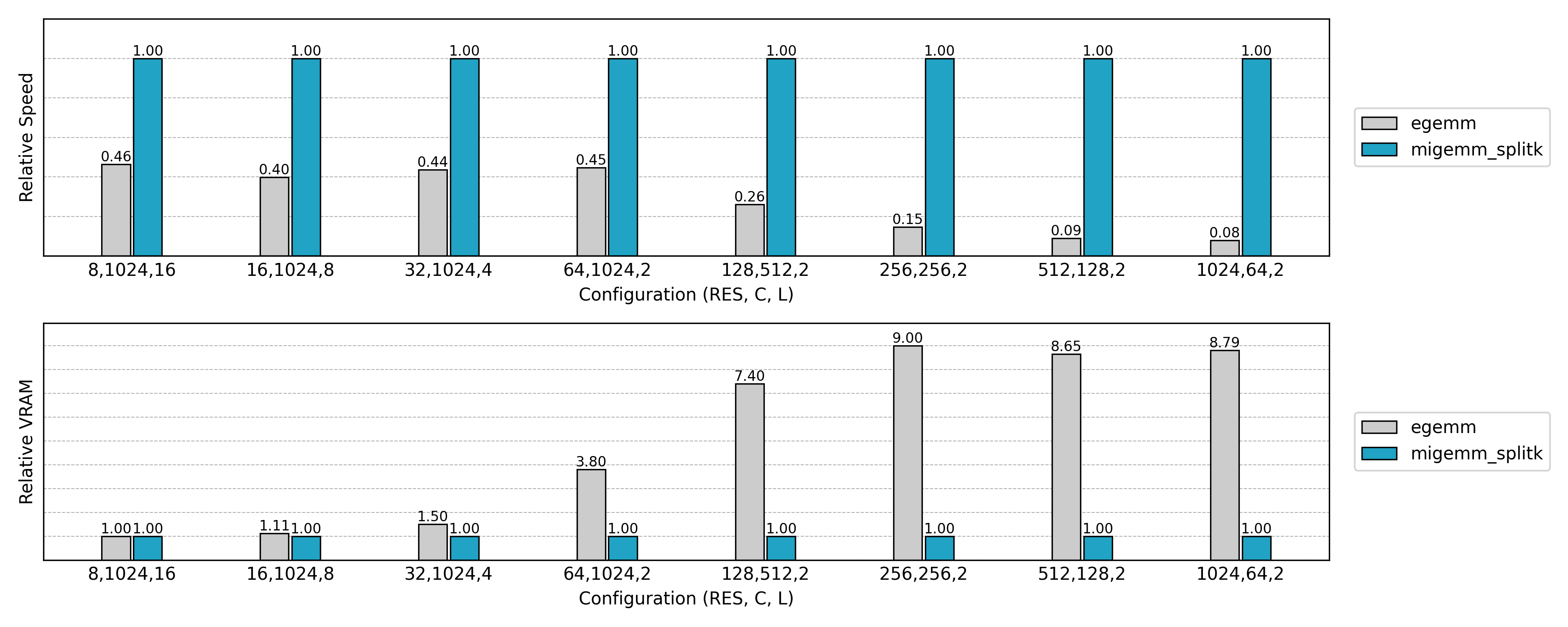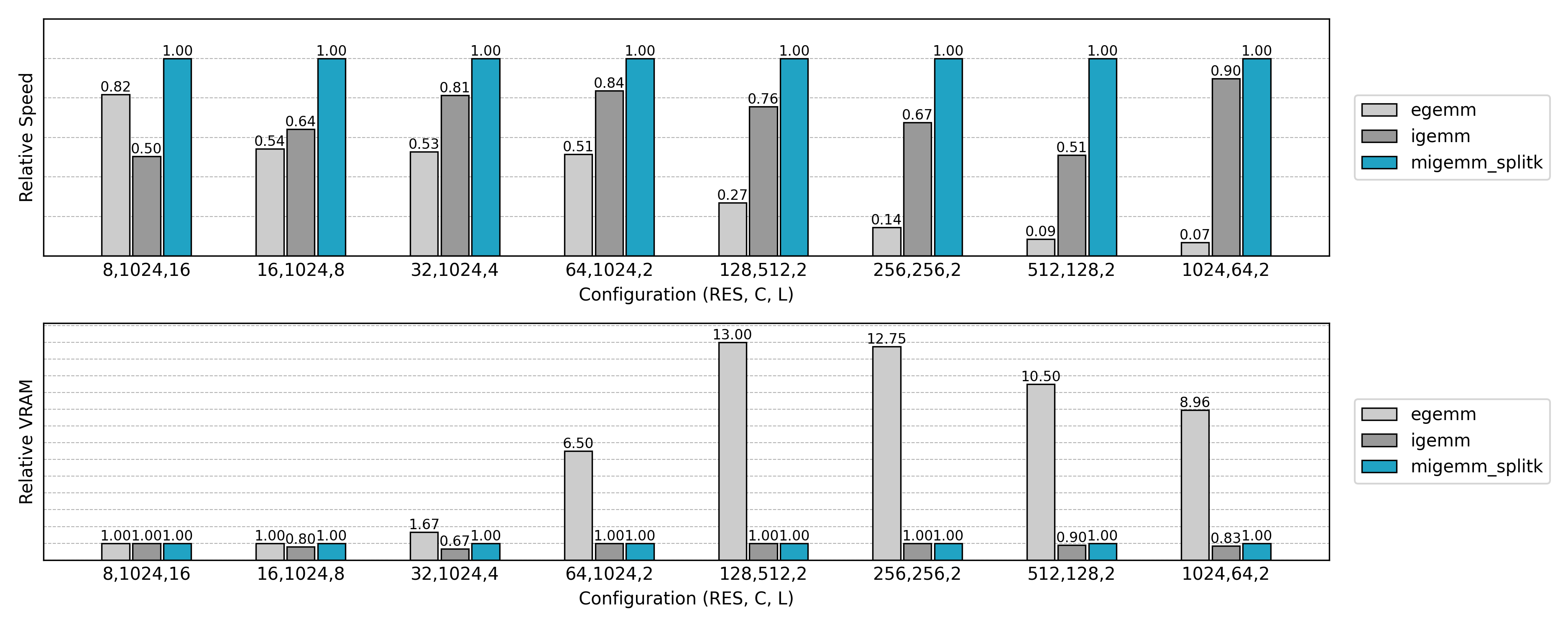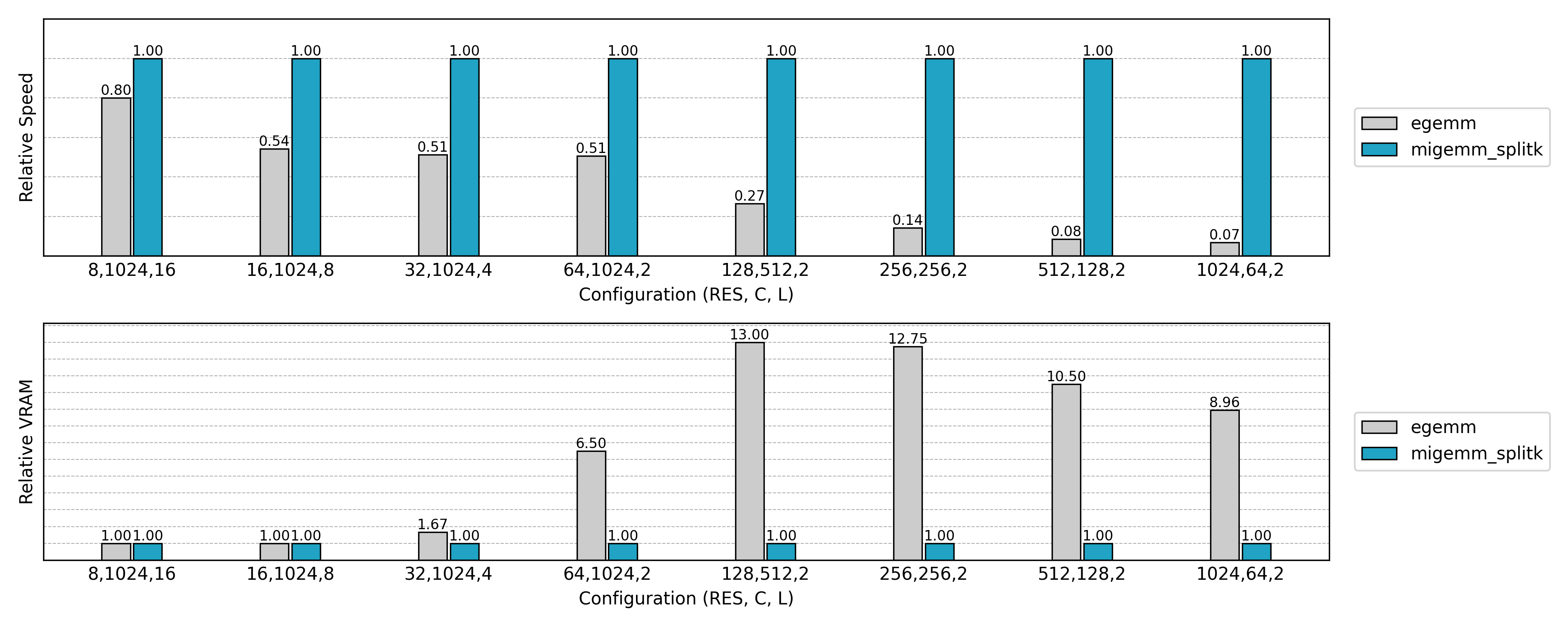与先前实现的非 Split K 版本比较,可见小 N 或小 Co 场景下的 GPU 利用率显著提升。