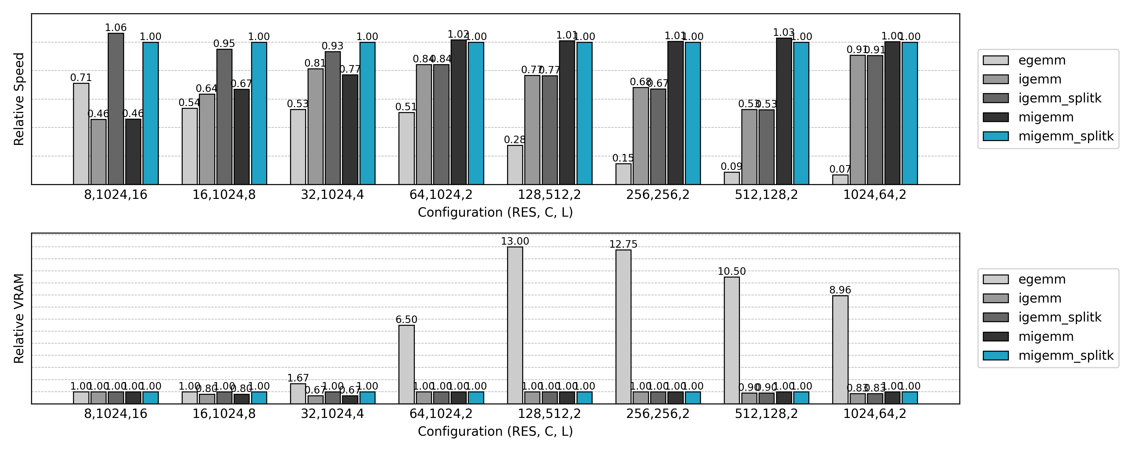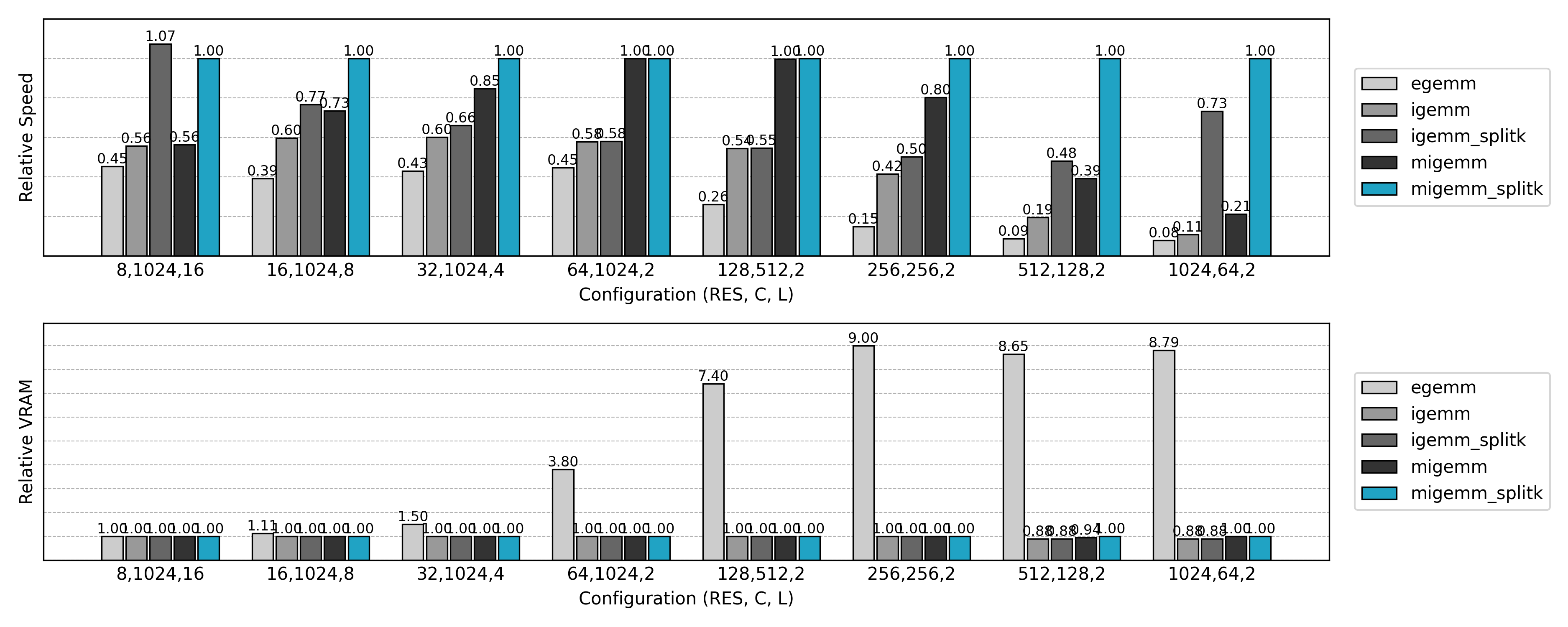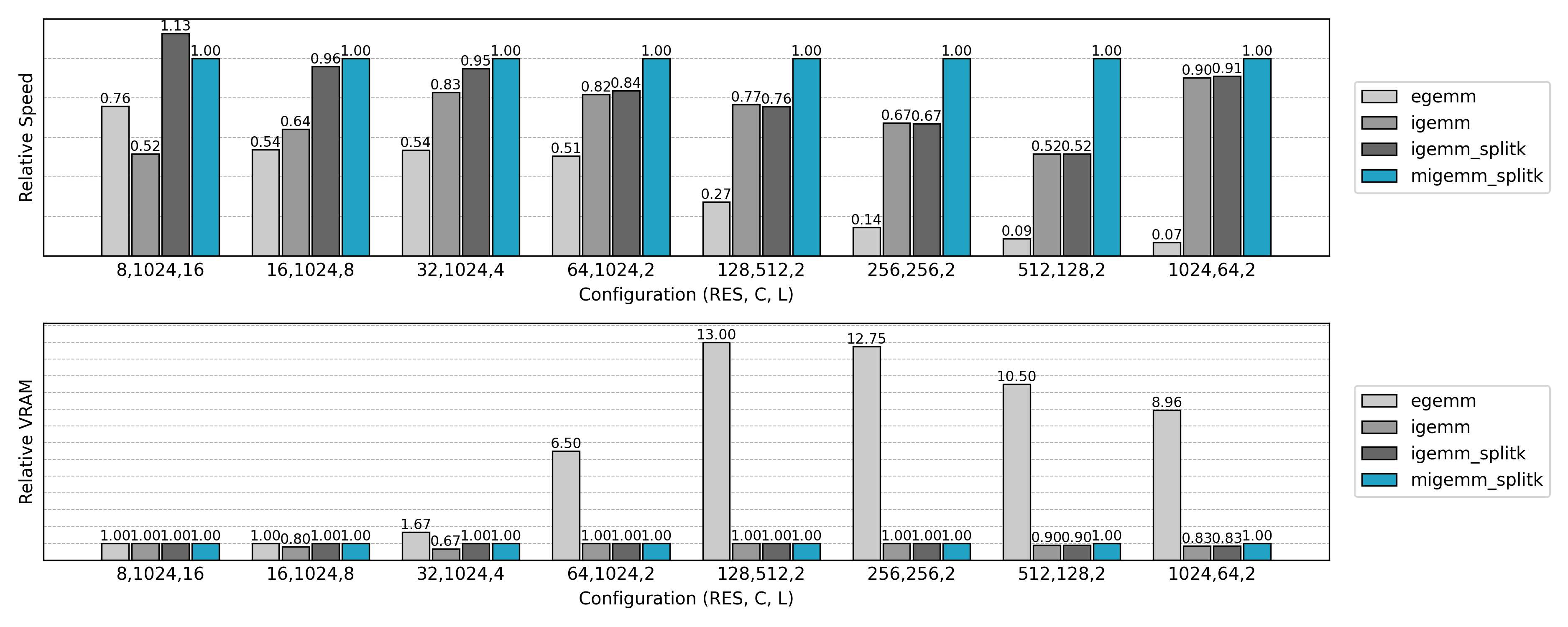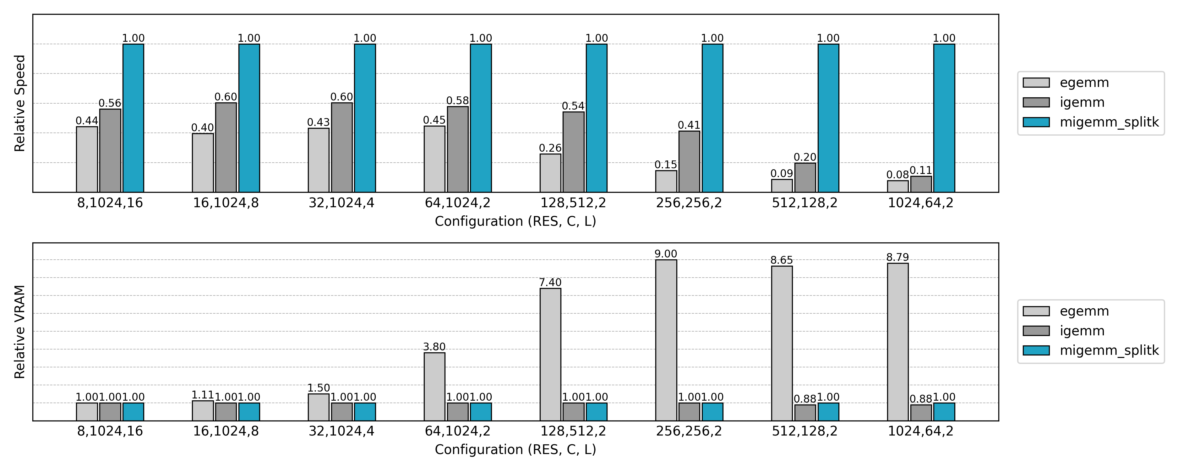 与先前实现的非 Split K 版本比较,可见小 N 或小 Co 场景下的 GPU 利用率显著提升。