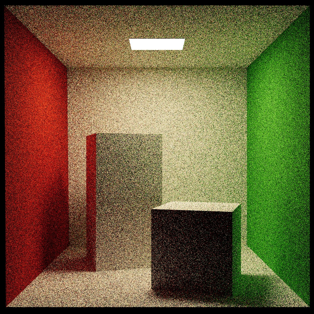 最朴素的随机游走算法,每次反射方向均匀采样球面。 由于没有任何形式的重要性采样,光线极少命中发光区域, 噪声极为明显,尤其是在距离光源较远的地方,例如屋顶的空调外机,亮度分布极不稳定。