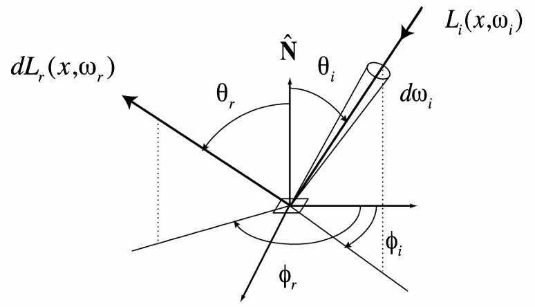 双向散射分布函数统一描述了材质表面对光的各种散射行为,包括反射(Reflection)和透射(Transmission)。它是一个比率函数,告诉我们某个角度的对应入射光,散射到某个出射方向的比例是多少。