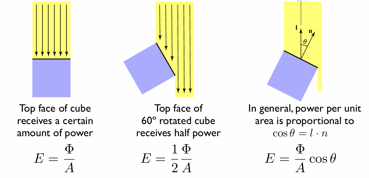 \[\Phi = \int_{\mathbb{S}^2} I\ \text{d}\boldsymbol{\omega} = 4\pi I, \quad I = \frac{\Phi}{4\pi}\]辐照度(Irradiance, $E$)