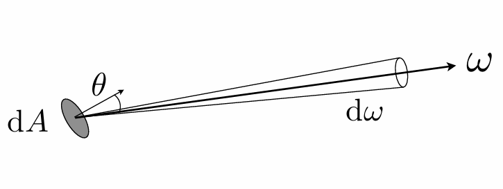 \[E = \int_\boldsymbol{\omega} L(\boldsymbol{p}, \boldsymbol{\omega}) \cos\theta \text{d}\boldsymbol{\omega}\]- $L(\boldsymbol{p},\boldsymbol{\omega})$ 是从方向 $\boldsymbol{\omega}$ 来的辐亮度