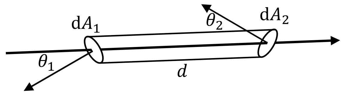 考察通过这两个面积微元围成管道的光线(同时通过两个面积微元),则光线穿过微元 $\text{d} A_1$ 和 $\text{d} A_2$ 的通量分别为: